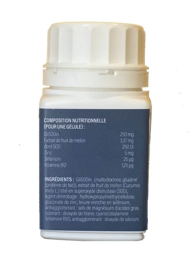 Ce produit innovant combine la SuperOxyde Dismutase (SOD), une puissante enzyme anti-oxydante et une protéine de blé, la gliadine, permettant de protéger la SOD des attaques acides dans l’estomac pour qu’elle reste intacte et active dans l’organisme. L’un des bienfaits de la SOD est de contribuer à protéger du vieillissement et du stress cellulaire, et participe également à l’amélioration de la qualité de la réponse immunitaire.