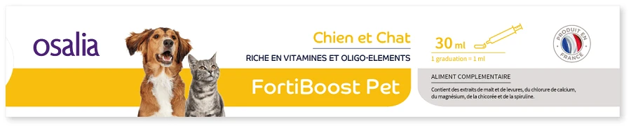 Fortiboost est un fortifiant pour chiens et chats. Il s’agit d’un aliment complémentaire riche en vitamines, oligo-éléments, prébiotiques, ginsens, grande ortie et spiruline.