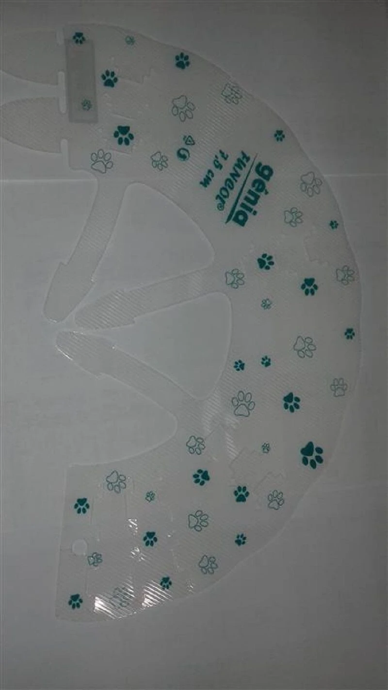 Le Carcan Funcol de chez Génia est en polypropylène transparent incolore, avec impression de motifs colorés en forme de pattes.
