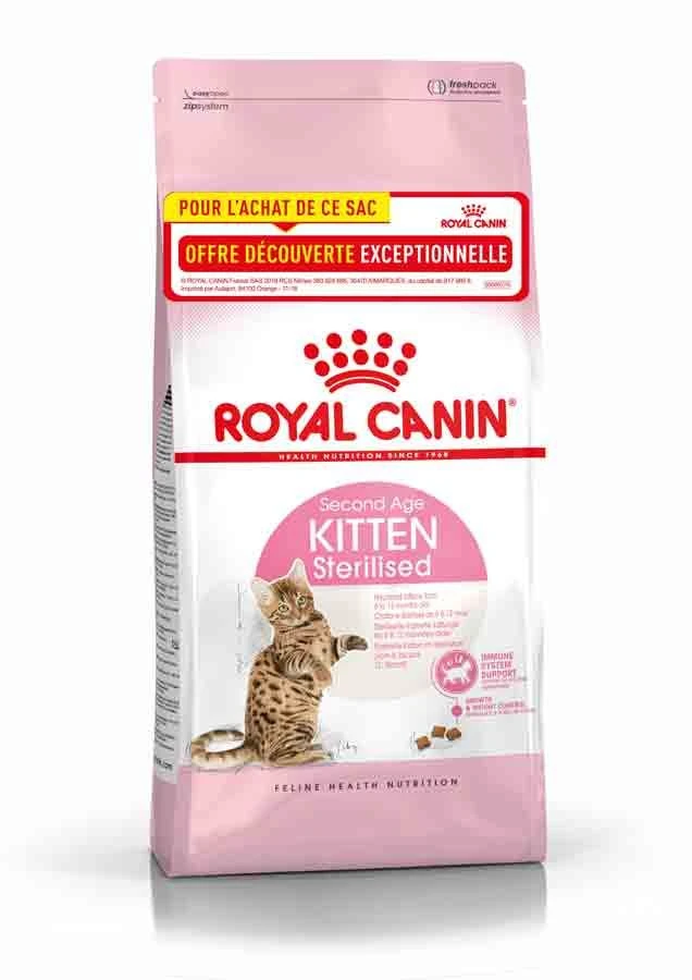 Royal Canin Feline Health Nutrition Kitten Sterilised est une alimentation complète pour les chatons stérilisés de 6 à 12 mois.