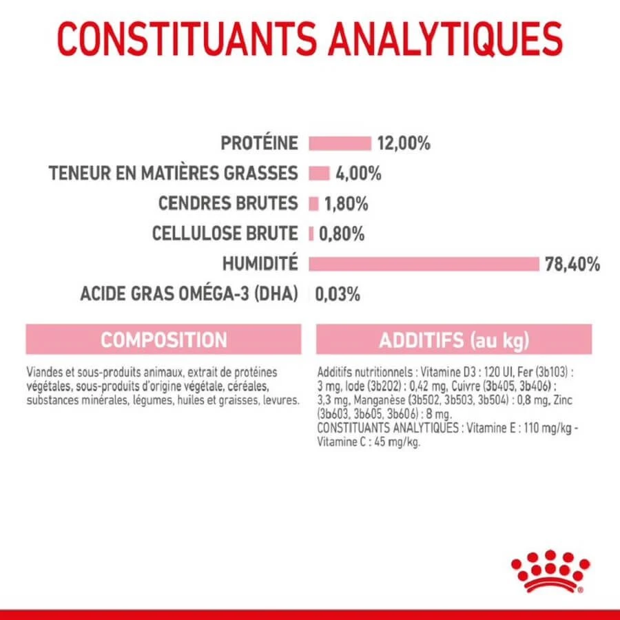 Cette alimentation humide favorise l’hydratation de votre félin et elle est disponible dans différentes textures : en sauce, en gelée ou en mousse. Ces sachets peuvent être donnés avec les croquettes Royal Canin Kitten pour offrir une alimentation mixte à votre animal.